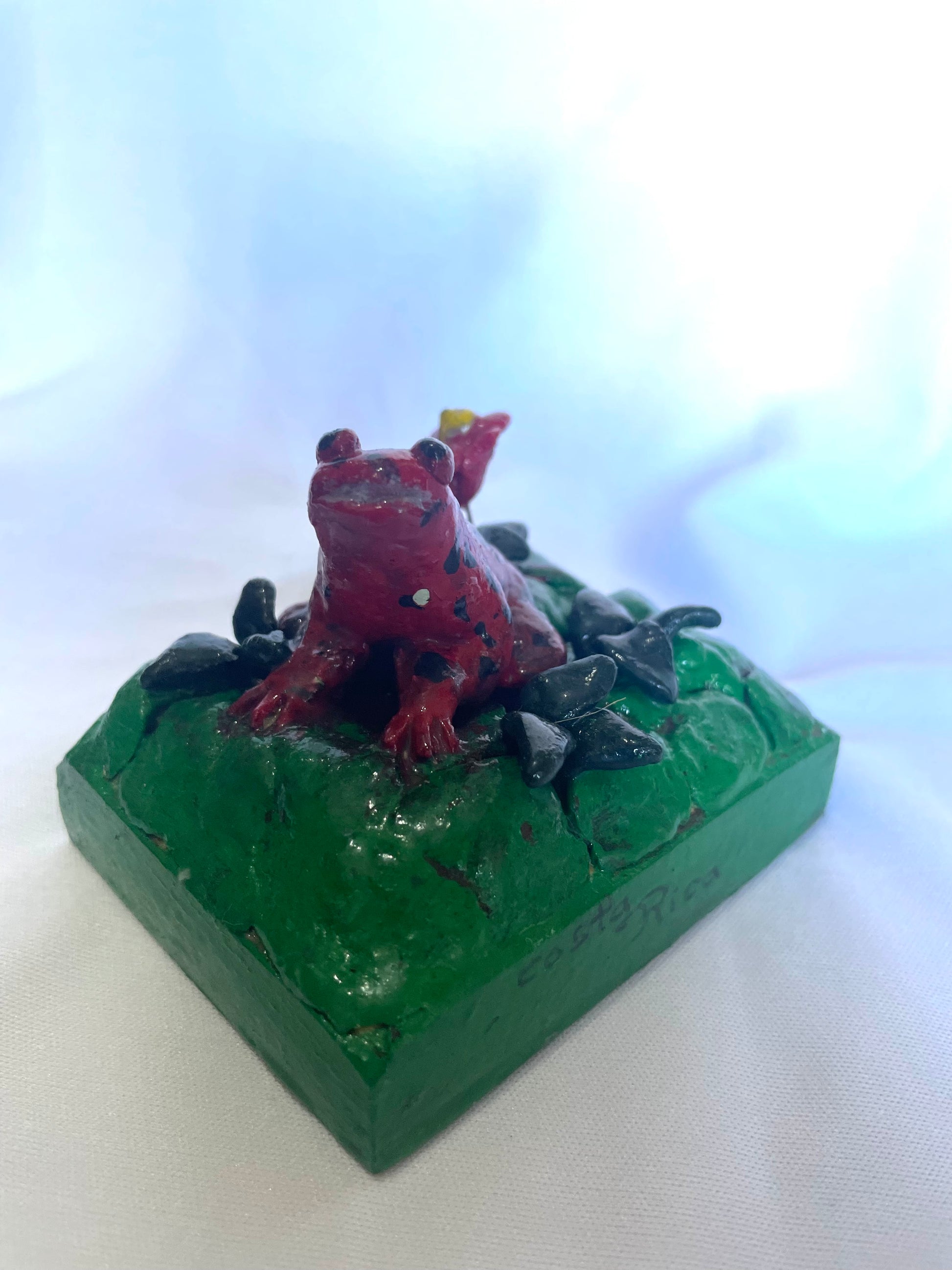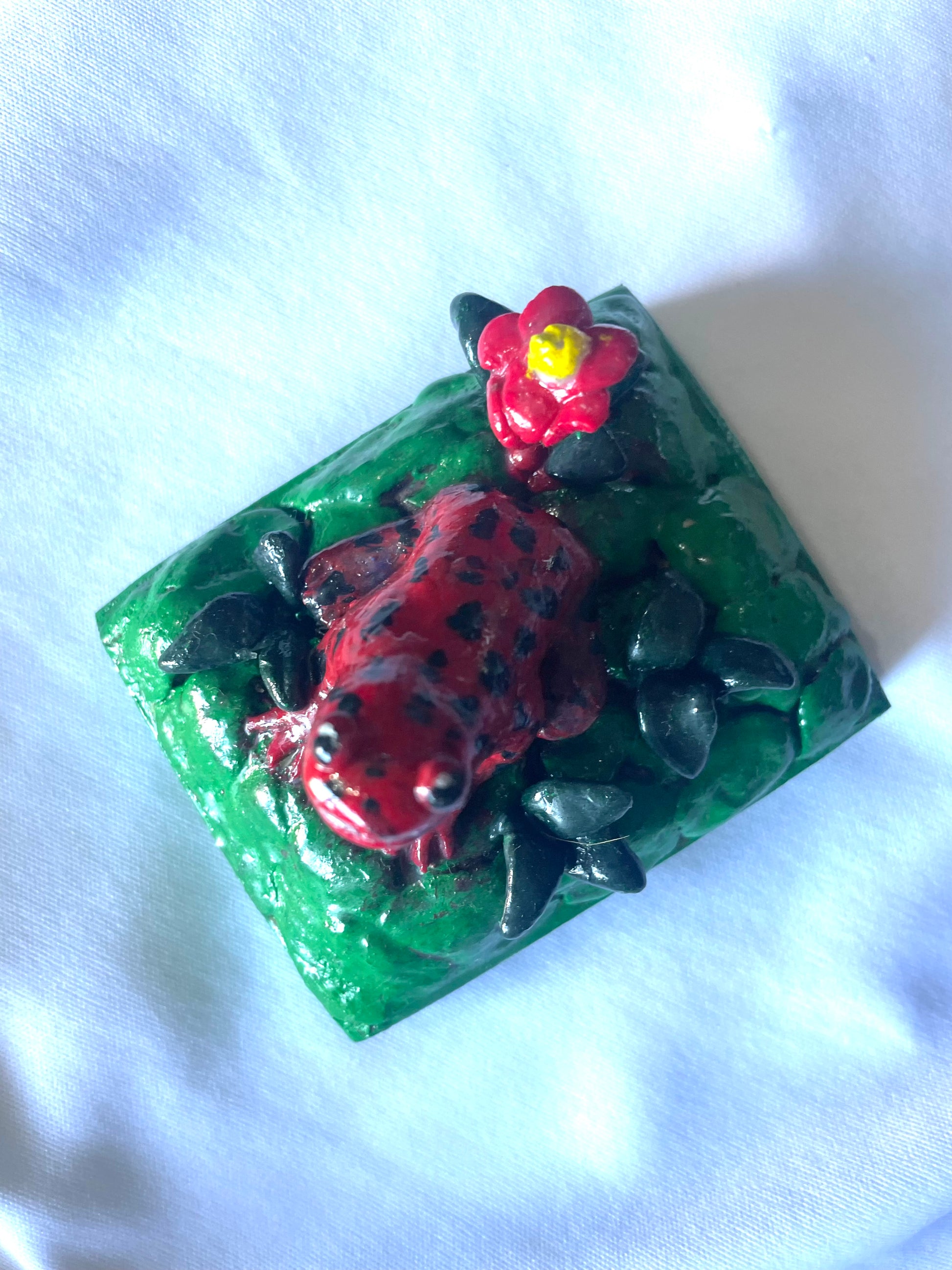 Añade encanto y alegría a tu espacio con esta simpática ranita roja decorativa.